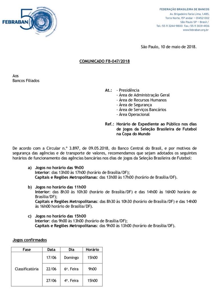 Notícias Expediente bancário nos dias de jogos da seleção brasileira Por Sincomercio - 23 de maio de 2018 Facebook Twitter Google+ Pinterest WhatsApp Email Print A Federação Brasileira de Bancos (Febraban) divulgou comunicado informando o horário de funcionamento dos bancos nos dias de jogos da seleção brasileira na copa do Mundo. Clique na imagem abaixo para consulta.