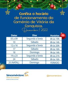 Horário especial de funcionamento do comércio de Vitória da Conquista no mês de dezembro de 2022, conforme Acordo Coletivo firmado pelo Sindicato do Comércio Varejista e Atacadista de Vitória da Conquista – Sincomérciovc, o Sindicato dos Empregados no Comércio – SECVC e a Câmara de Dirigentes Lojistas – CDL.