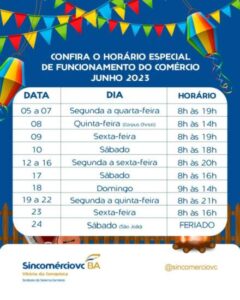 O Sindicato do Comércio Varejista e Atacadista de Vitória da Conquista, a Câmara de Dirigentes Lojistas e o Sindicato dos Empregados no Comércio de Vitória da Conquista firmaram acordo estabelecendo o horário especial de funcionamento do comércio para o período dos festejos juninos.