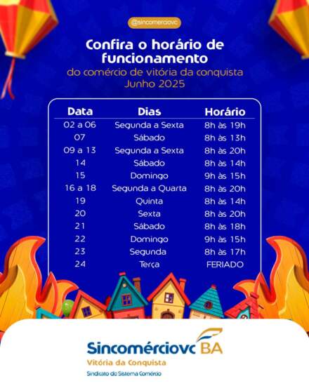 O Sindicato do Comércio Varejista e Atacadista de Vitória da Conquista, a Câmara de Dirigentes Lojistas e o Sindicato dos Trabalhadores no Comércio de Vitória da Conquista firmaram acordo estabelecendo o horário especial de funcionamento do comércio para o período dos festejos juninos.